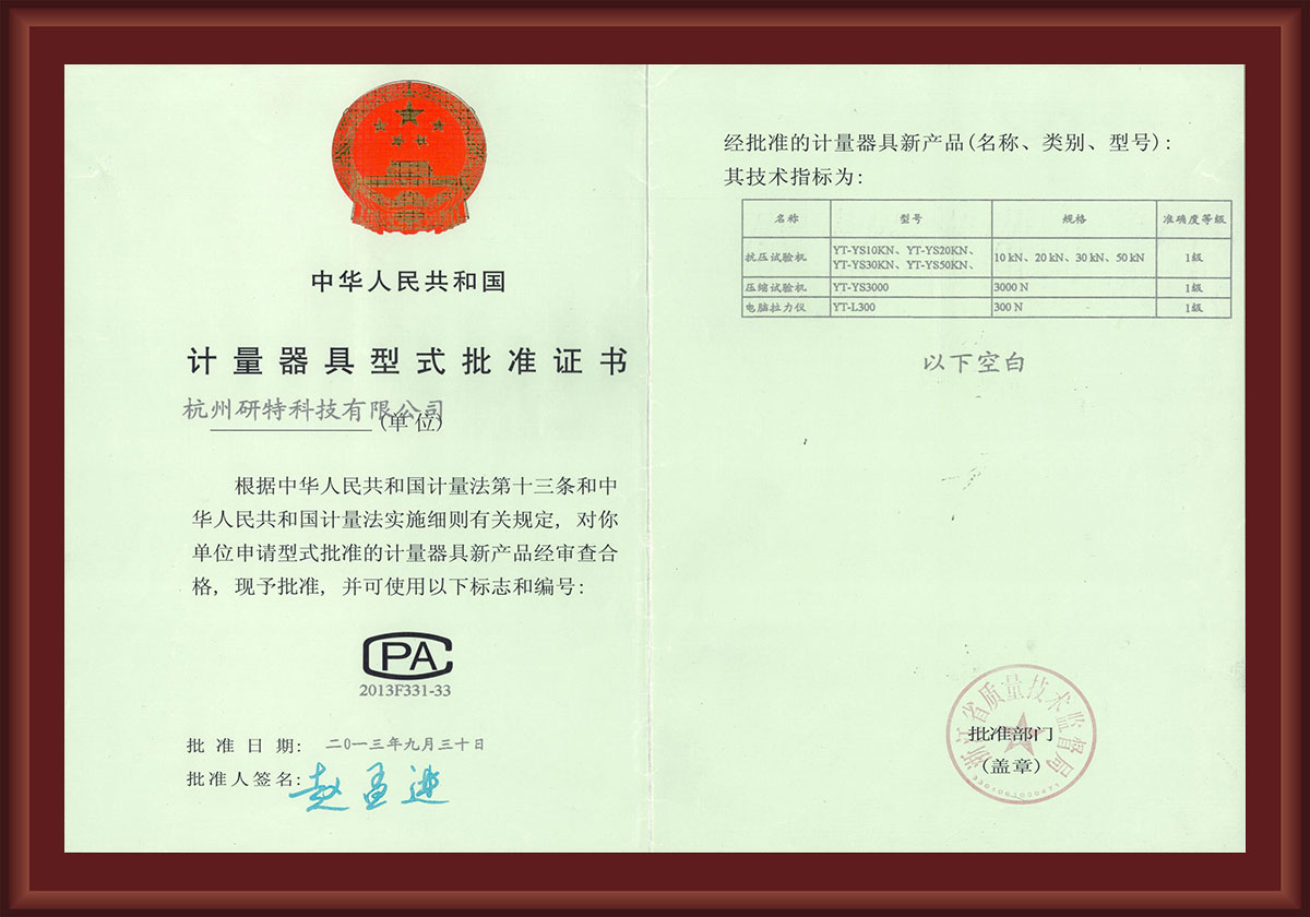 • 中华人民共和国计量器具形式批准证书